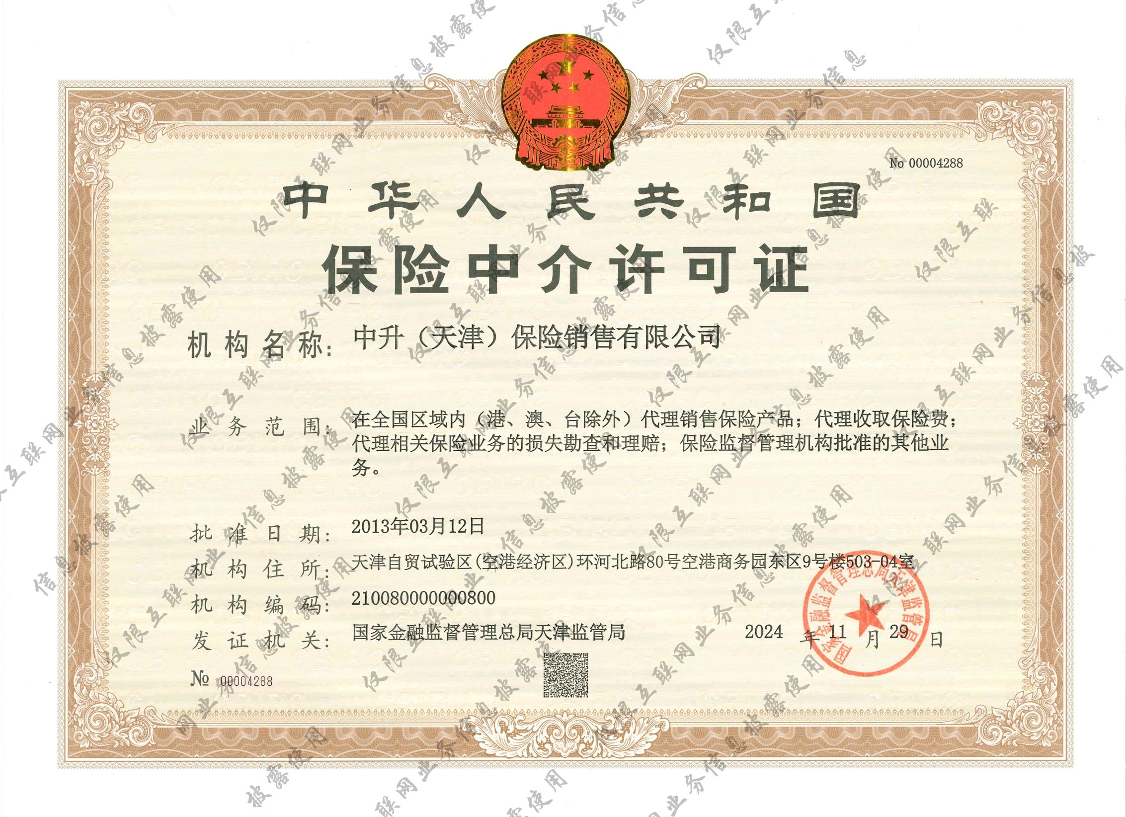 业务经营范围:在全国区域内(港、澳、台除外)代理销售保险产品;代理收取保险费;代理相关保险业务的损失勘查和理赔;中国银保监会批准的其他业务。